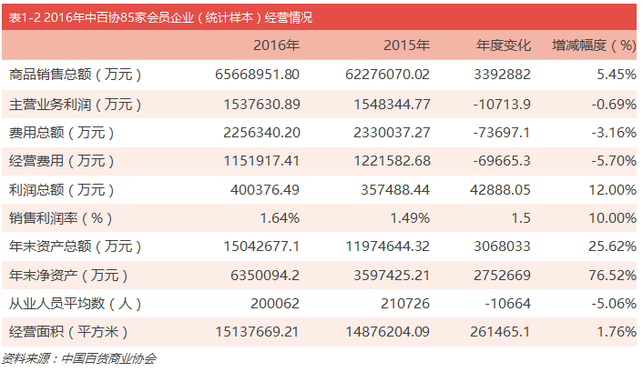 2016年中國(guó)百貨商業(yè)協(xié)會(huì)85家會(huì)員企業(yè)年度經(jīng)營(yíng)統(tǒng)計(jì)數(shù)據(jù)顯示,百貨店銷售總額6566.90億元,比2015年 的6227.61億元增長(zhǎng)了5.45%;利潤(rùn)總額為40.04億元,比2015年的35.75億元增長(zhǎng)12.00%;主營(yíng)業(yè)務(wù)利潤(rùn) 為154億元,比2015年的155億元下降0.69%。年末資產(chǎn)總額達(dá)到1504.27億元,同比增長(zhǎng)25.62%。2016 年會(huì)員企業(yè)經(jīng)營(yíng)面積有所增加,為1514萬(wàn)平方米,同比增長(zhǎng)1.76%。從業(yè)人員平均數(shù)為20萬(wàn)人,比2015年 的21.萬(wàn)人減少了5.06%(見表1-2)。