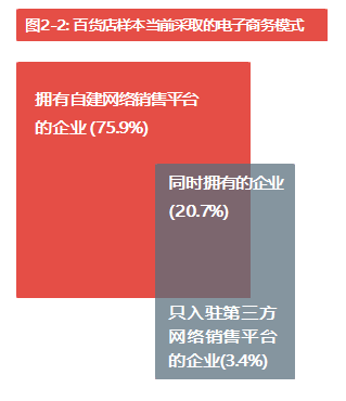 根據(jù)中國(guó)百貨商業(yè)協(xié)會(huì)及利豐研究中心的調(diào)查i發(fā)現(xiàn),46.9%的受訪企業(yè)已經(jīng)開展了電子商務(wù)業(yè)務(wù) (見圖2-1)。其中,75.9%的企業(yè)擁有自建網(wǎng)絡(luò)銷售平臺(tái),20.7%的企業(yè)同時(shí)擁有自建網(wǎng)絡(luò)銷售平臺(tái)及入駐第三方網(wǎng)絡(luò)銷售平臺(tái)(見圖2-2),只入駐第三方網(wǎng)絡(luò)銷售平臺(tái)的企業(yè)只有3.4%。