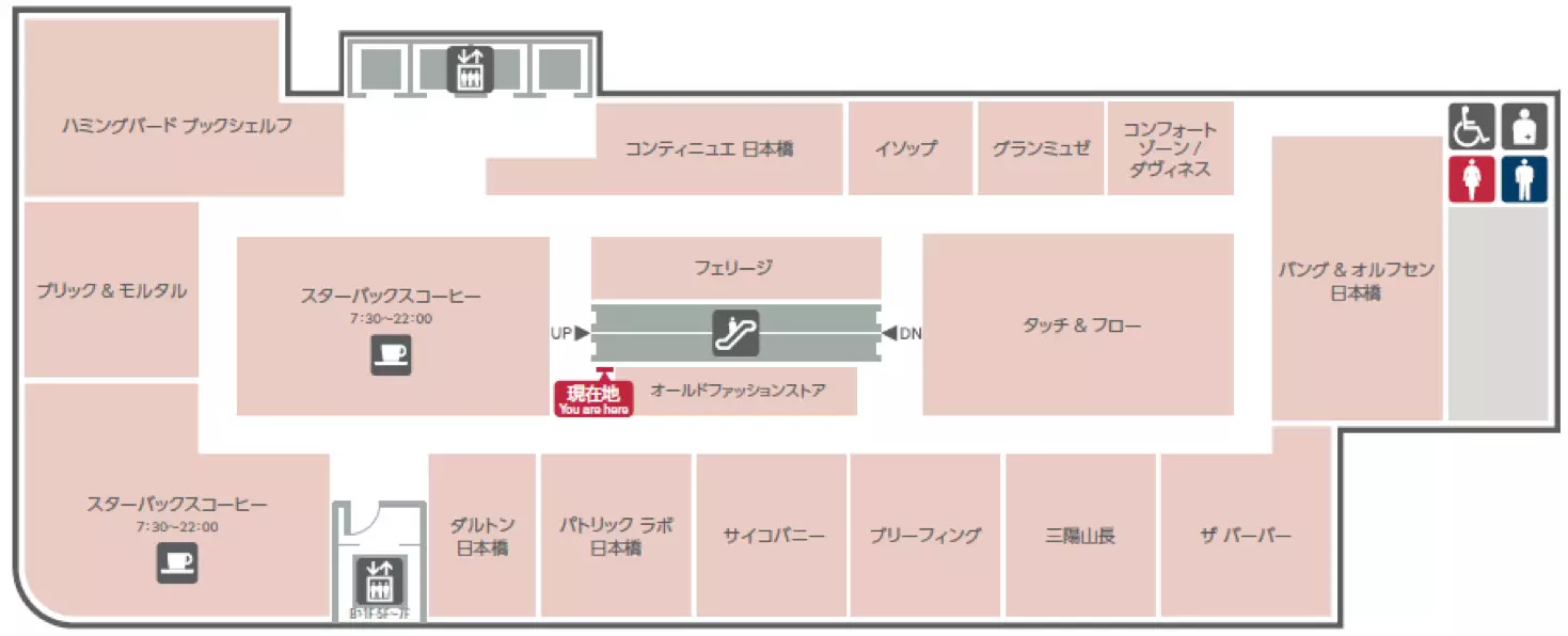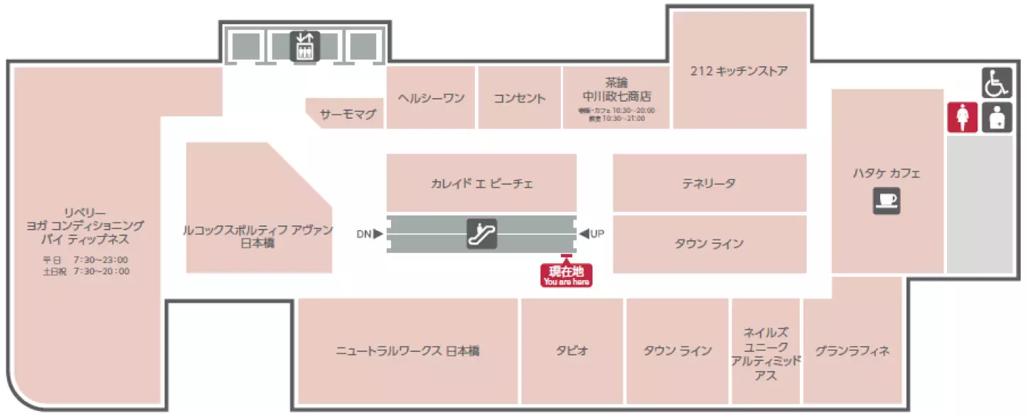 1F為在日本橋生活的人們提供可以散步的街道,其中有10家店舗(全館13店舗)在清晨7點30分即開始營業。