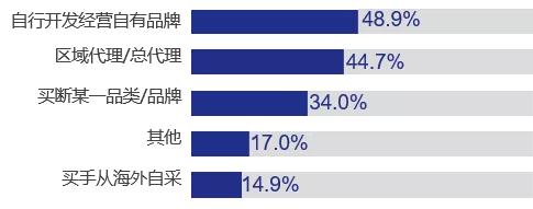 在經營自采自營的企業當中,48.9%的企業選擇自行開發經營自有品牌;44.7%采取區域代理或總代理的方式; 34.0%以買斷某一品類或品牌的形式營運