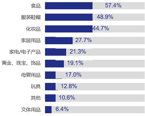 商品品類方面,57.4%的企業選擇食品作自采自營,其次為服裝鞋帽 (48.9%) 及化妝品