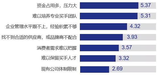 調查顯示,百貨零售企業認為開發自有品牌面臨最大的挑戰依次為 "資金占用多,壓力大" 、"獲得市場認可時間過長" 及 "高庫存風險",以1到6分為標準的話(6分表示挑戰最大),這三項的得分分別是4.33、4.26 及 4.19。