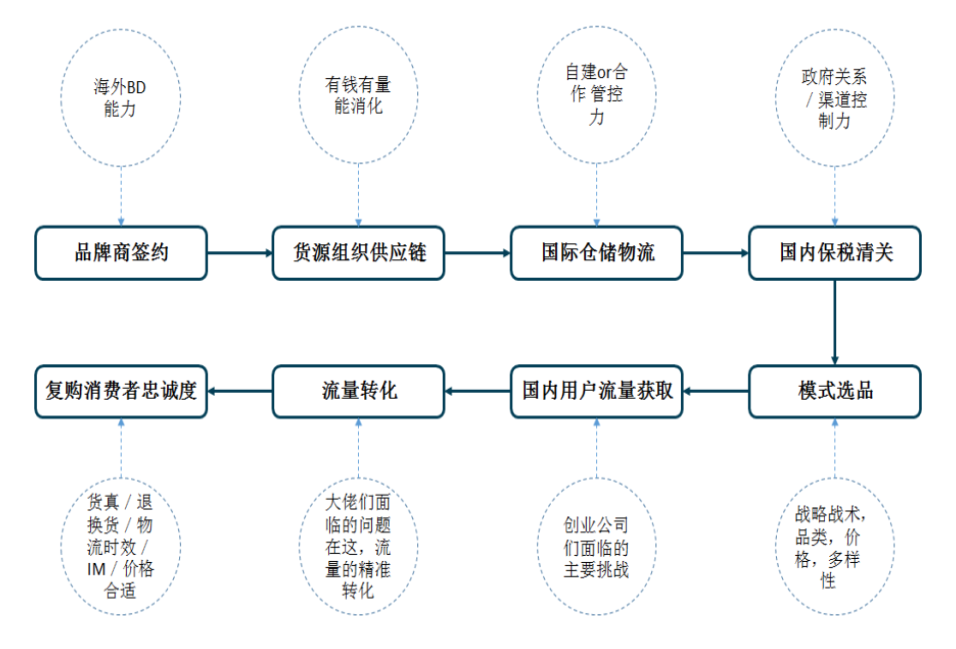 典型玩家有淘寶全球購、洋碼頭,海蜜。海外買手入駐平臺開店,從品類來講,以長尾非標品為主,構建了供應鏈和選品的寬度和多元化。而C2C達人經濟模式可以在精神社交層面促進用戶沉淀,獲得價值觀層面的認同和分享,建立個人信任機制。痛點在于傳統的靠廣告和返點盈利的模式,服務體驗難以保證,個人代購也存在法律政策風險。