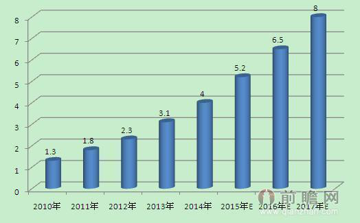 圖表:2010-2017年中國跨境電商交易規模及預測(單位:萬億元)