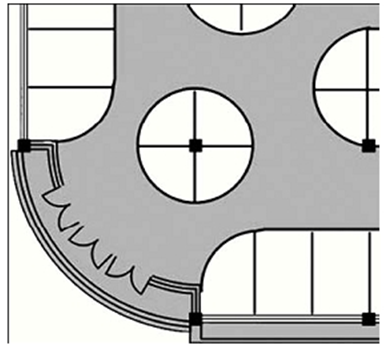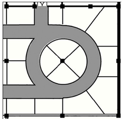 在正方形樓面積中,多采用環形設計。在交錯道路的平面中,有間距大的多采用弧形或環形設計。