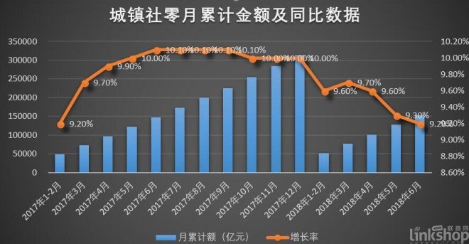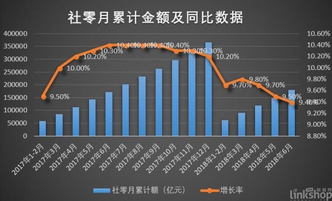 雖然國家統計局數據顯示,1-6月份,我國社會消費品零售總額(以下簡稱社零)為180018億元,同比增長9.4%。但從總體看,上半年整個社會零售環境正逐漸惡化。總體呈現以下幾個特點: