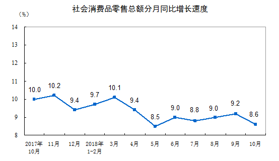 2018年10月份,社會消費品零售總額35534億元,同比名義增長8.6%(扣除價格因素實際增長5.6%,以下除特殊說明外均為名義增長)。其中,限額以上單位消費品零售額12479億元,增長3.7%。
