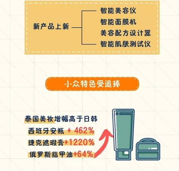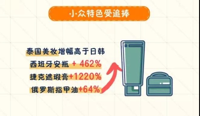 首先,有特色的小眾品牌具備了明星潛質(zhì)。比如說,一提到美妝品牌,我們第一個想到的是美日韓等國的知名品牌,但白皮書顯示,西班牙的安瓶增長高達 462%、捷克的遮瑕膏增長1220%、俄羅斯的指甲油增長達64。小眾品牌“逆襲”起來原來這么恐怖?