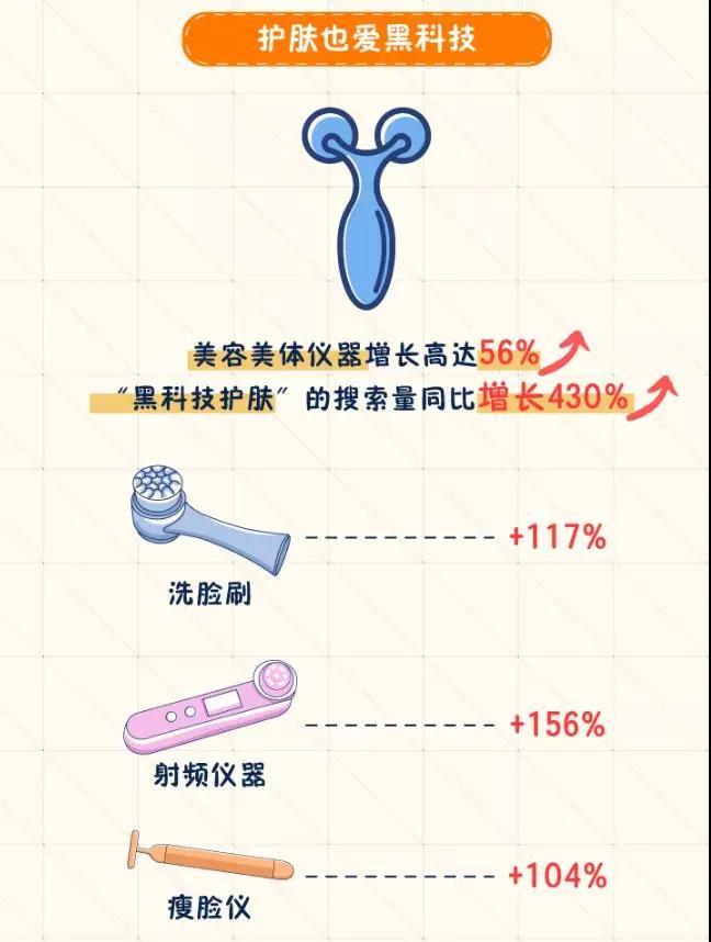 值得注意的是,今年“黑科技護膚”的搜索量同比增長427.19%,說明科技護膚是全民的需求。所以,智能美容儀、智能面膜機、美容配方設計器、智能肌膚測試儀等自帶“黑科技”的產(chǎn)品都在搶著上新。