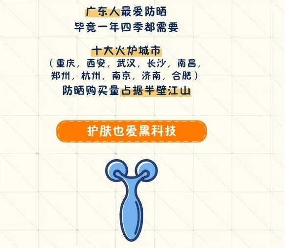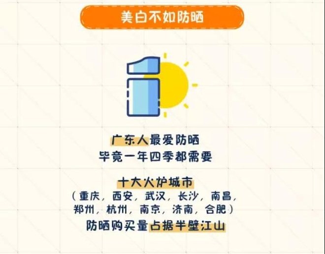 還有,美白不如防曬。白皮書顯示,廣東人最愛防曬,畢竟因為氣候原因,廣東人一年四季“不可一日無此君”;同理,十大火爐城市(重慶、西安、武漢、長沙、南昌、鄭州、杭州、南京、濟南、合肥)也理所當然地占據(jù)了防曬購買量的半壁江山。