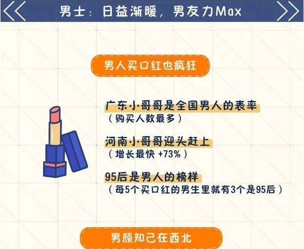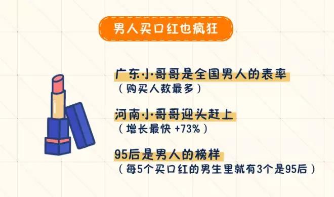 萬萬沒想到,男人買起口紅也一樣瘋狂!其中廣東小哥哥最愛購買口紅,堪稱全國男人之表率;河南小哥哥以73%的增長在后面緊追;而每5個買口紅的男生里就有3個是95后,95后真是實力寵女友!