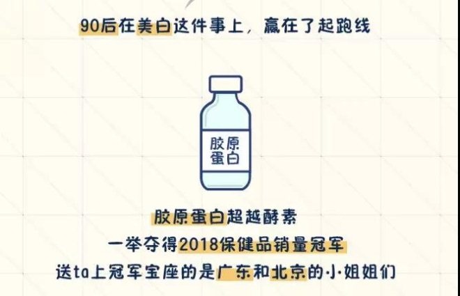 而膠原蛋白也超越了酵素,一舉多得了2018年保健品銷量冠軍,90后尤其喜歡購買這類產(chǎn)品。這也難怪,在美白這件事上,承前啟后、繼往開來的90后當然會贏在起跑線上。