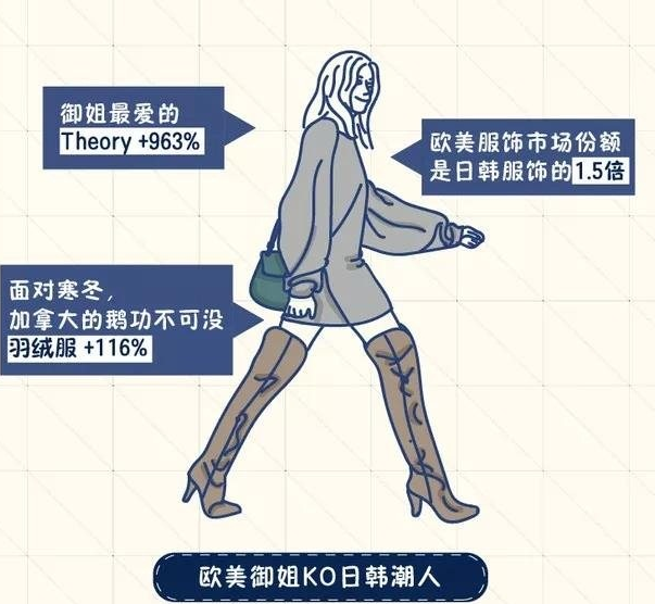 海淘女裝風格上,歐美御姐風完勝日韓潮人風。統(tǒng)計顯示,今年海淘歐美服飾的市場份額是日韓服飾的1.5倍,其中,御姐最愛的Theory 增長高達963%。