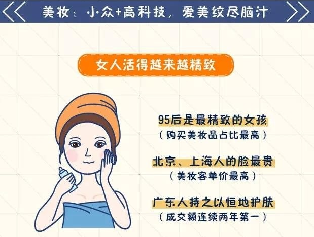 首先,女性消費者特別是95后,在購買美妝品上一點都不手軟。其中,北京、上海人花在美妝上的客單價最高,看來,“帝都”和“魔都”不僅房子貴,臉也是最貴的;而廣東人連續(xù)兩年奪得成交額之冠,喜獲持之以恒護膚獎,中國第一富省果然名不虛傳。而且,人們的化妝技巧也越來越好,比如說高光同比增長了115%,而隨著女人對美妝的需求越來越旺盛,美妝品類的銷量也讓人嘆為觀止:2018年全球購的面膜的銷量連起來可繞地球5.5圈。