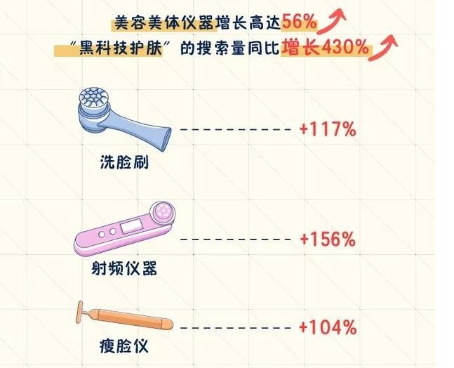 白皮書顯示,今年美容體儀器的增長高達56%,其中洗臉刷增長117%,射頻儀器增長156%,瘦臉儀增長104%,這些產(chǎn)品都自帶科技屬性。