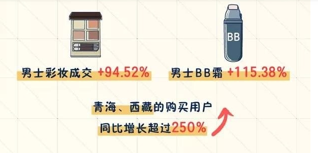 除了口紅外,男人們的最愛還有包包和彩妝。“一言不合就買包包”讓今年男士包袋類購買增長高達95%;彩妝方面,西北地區(qū)的男士彩妝成交同比增長94.52%,男BB霜同比增長115.38%,青海、西藏的購買用戶同比增長超過250%,原來“男顏知己在西北”啊。
