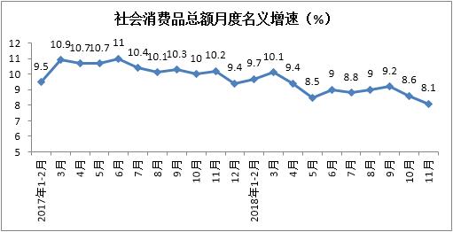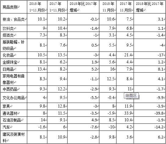 一、1-11月份消費品市場累計增長9.1%,增速近兩月持續放緩