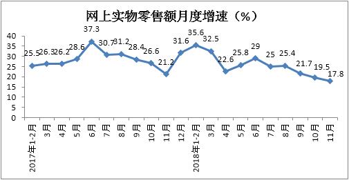 二、1-11月份網上實物商品零售額增速累計增長25.4%,月度增速持續三個月放緩