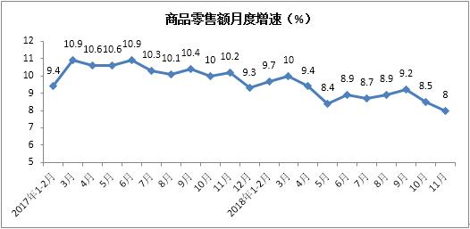 1-11月份,商品零售額實現306799億元,累計增長9.0%,增速與1-10月份放緩0.1個百分點。其中11月份同比增長8%,增速較上月放緩0.5個百分點。
