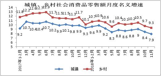 五、1-11月份城鄉消費品市場增速較上月均放緩,鄉村增速相對較快