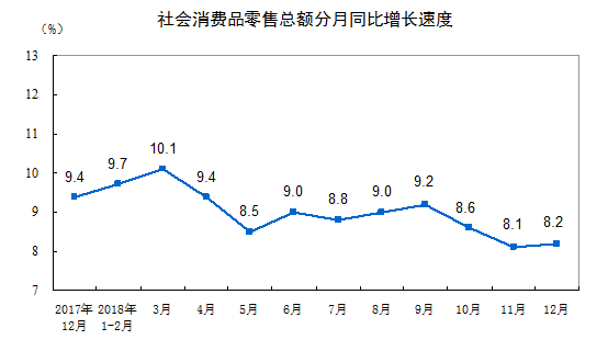 2018年12月份,社會消費品零售總額35893億元,同比名義增長8.2%,增速比11月份提高0.1個百分點。其中,限額以上單位消費品零售額15084億元,增長2.4%。
