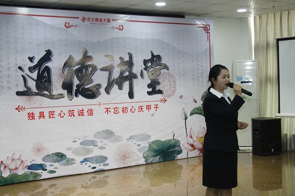 “沐浴道德陽光,感悟道德力量”。為大力弘揚(yáng)中華傳統(tǒng)美德,進(jìn)一步推進(jìn)企業(yè)道德建設(shè)。3月28日,百大商業(yè)大廈承辦了以“獨(dú)具匠心筑誠信、不忘初心慶甲子”為主題的百大集團(tuán)第50期道德講堂。百大集團(tuán)商學(xué)院院長方敏,常青街道團(tuán)工委書記、文明辦副主任史先揚(yáng),常青街道金寨南路社居委主任胡芳受邀來到活動現(xiàn)場。