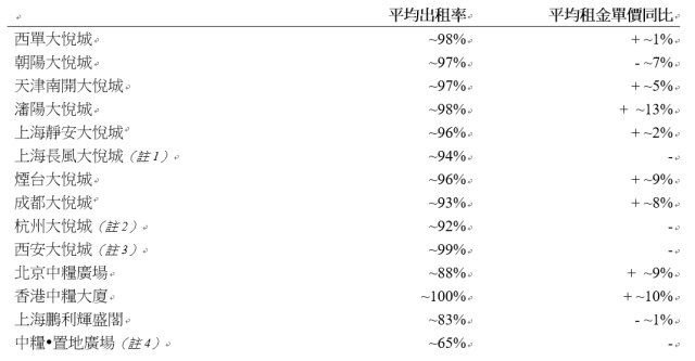 4月24日,大悅城地產(chǎn)發(fā)布了其2019年首季營運數(shù)據(jù)。公告顯示,在2019年1-3月報告期內(nèi),大悅城地產(chǎn)投資物業(yè)運營維持高水平,已開業(yè)的大悅城出租率持續(xù)高位運營,其中西安大悅城達到99%,沈陽大悅城平均出租單價同比實現(xiàn)雙位數(shù)增長;物業(yè)開發(fā)方面,公司合同銷售總面積約為48,765平方米,合同銷售總金額約人民幣9.01億元。.