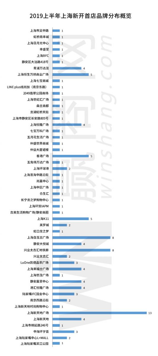 總的來(lái)看,這些首店品牌主要分布在南京西路商圈、靜安寺商圈、淮海路商圈、陸家嘴商圈等市級(jí)商圈內(nèi),個(gè)別區(qū)域商圈緊隨其后。(文末附2019上半年上海新開(kāi)首店品牌詳細(xì)表格)