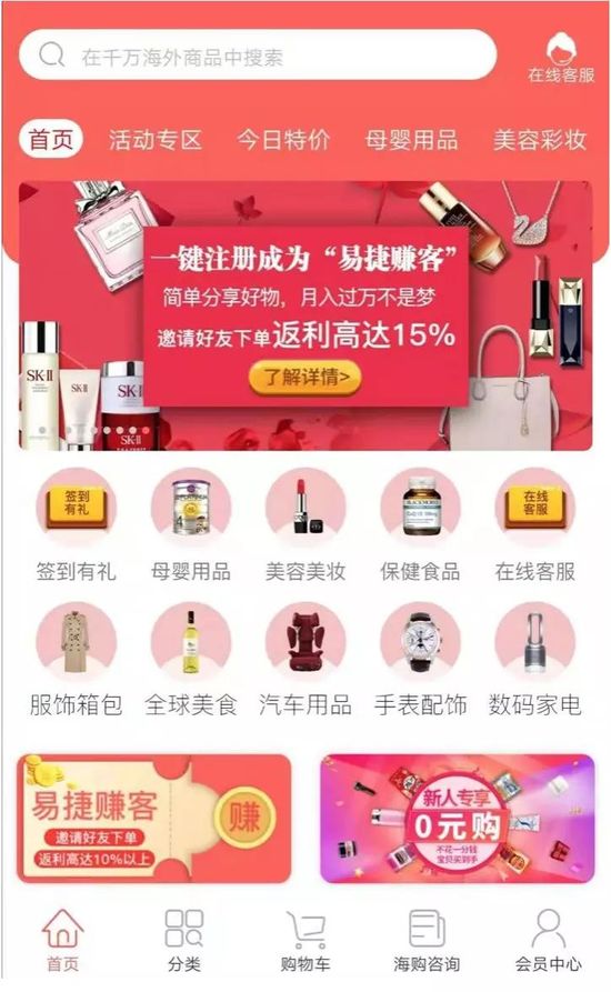 二是豐厚的推廣獎勵。據了解,易捷賺客有三種賺錢模式:首先,賺客引導新用戶進入易捷海購商城購物,可以獲得用戶訂單金額2%的基礎獎勵。“你分享出去二維碼,然后別人通過你這個二維碼注冊成為會員之后,這個會員當年所有消費訂單都有2%的提成,就相當于你一次注冊就可以躺著收錢了。”Simeng Lee說。
