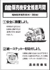自販機致人死亡事件,在行業發展十年間發生數起,通產省及地方政府部門不僅下發了“確保自販機安全”的通知及管理條例,還將每年十月作為“自販機安全月”,與行業共同推動、提高對安全的重視程度。