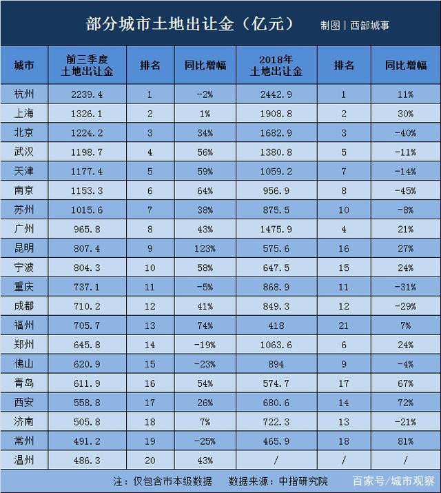 西部菌依據(jù)中指研究院等機構(gòu)的相關(guān)數(shù)據(jù),對前三季度的土地出讓金進行了簡單梳理,下圖是賣地收入TOP20城市的情況: