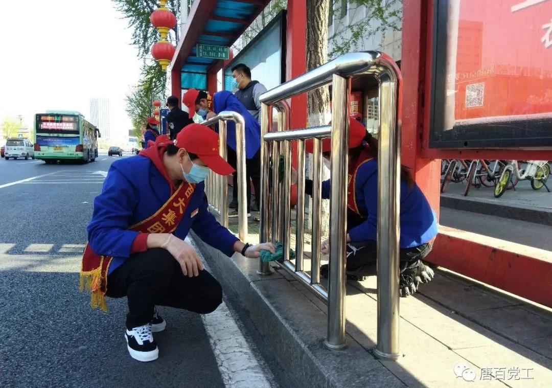 志愿者們清理公交車站周邊雜物、擦拭站臺(tái)扶廊。