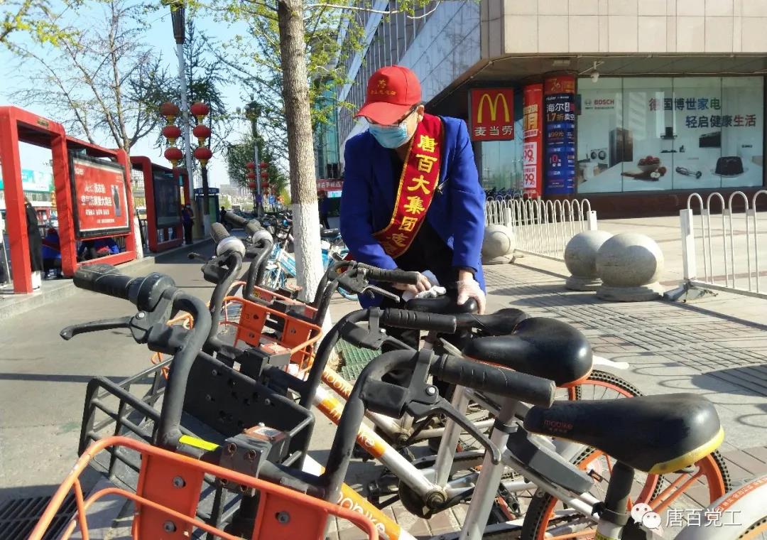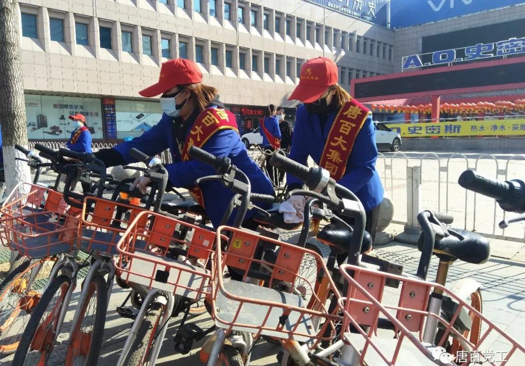 志愿者們擺放周邊亂停的共享單車、并做好清潔。
