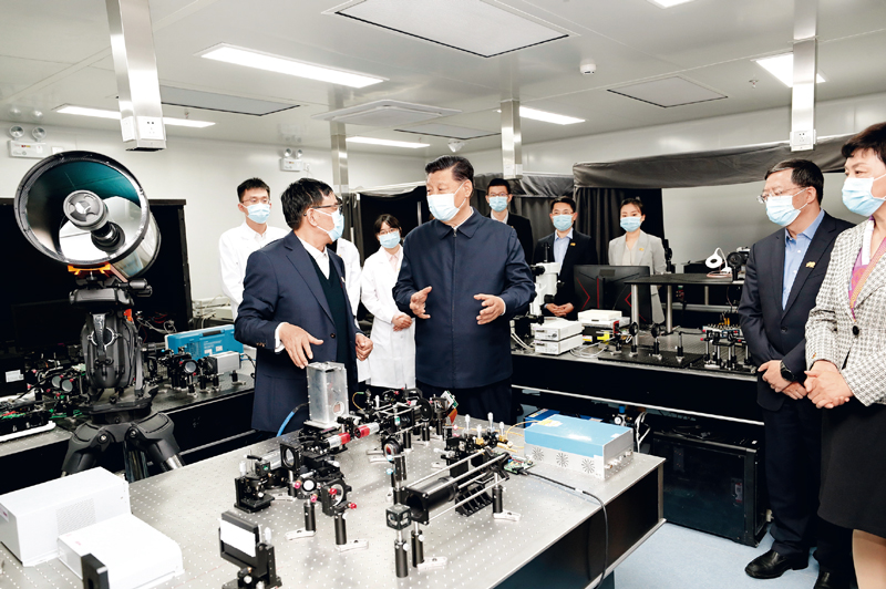 2021年4月19日,在清華大學建校110周年校慶日即將來臨之際,中共中央總書記、國家主席、中央軍委主席習近平來到清華大學考察。這是習近平在清華大學成像與智能技術實驗室同師生們親切交談。新華社記者 黃敬文/攝